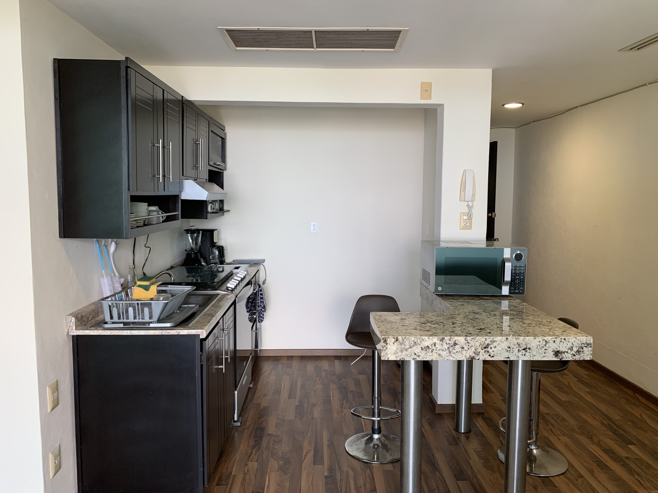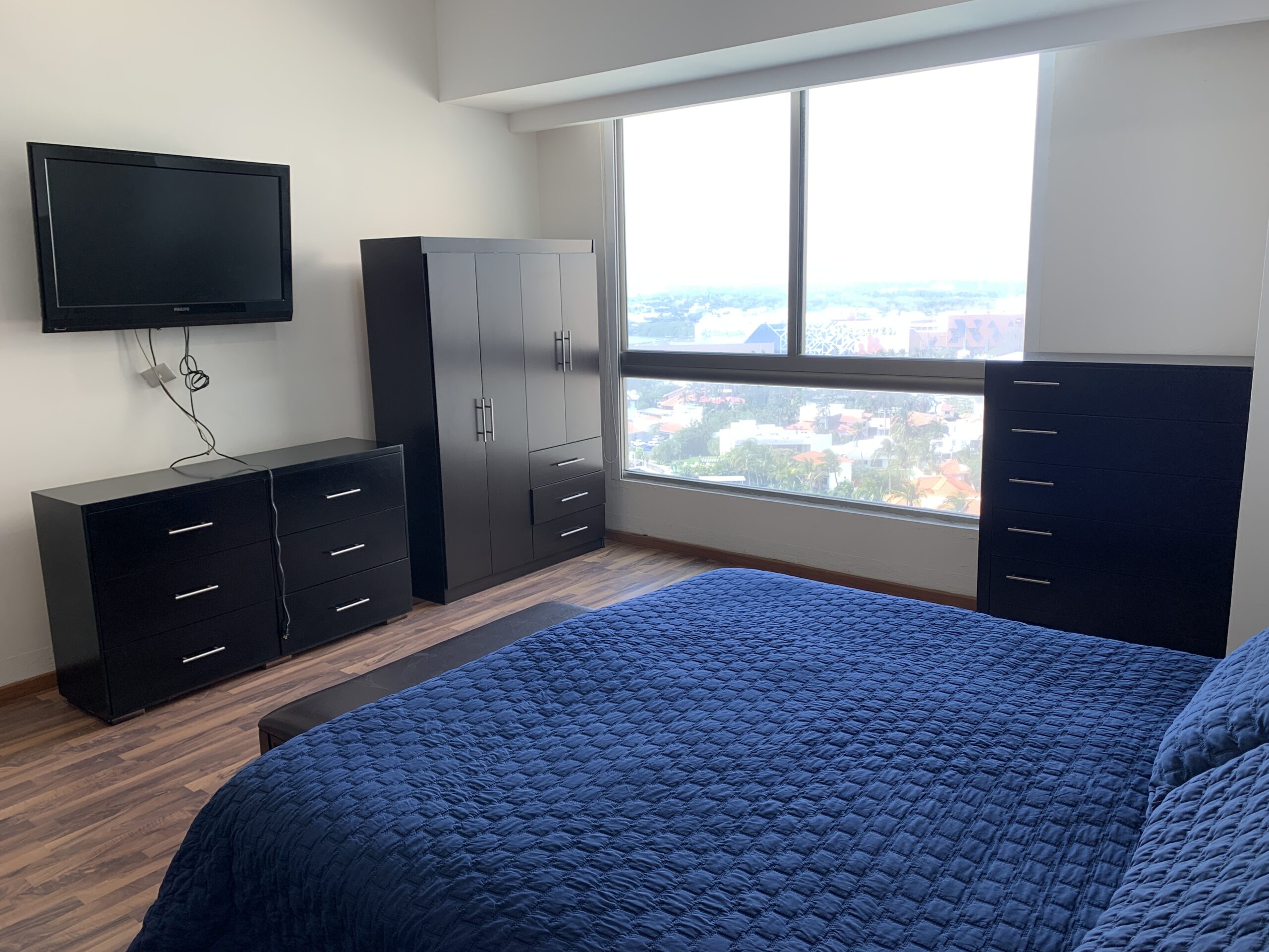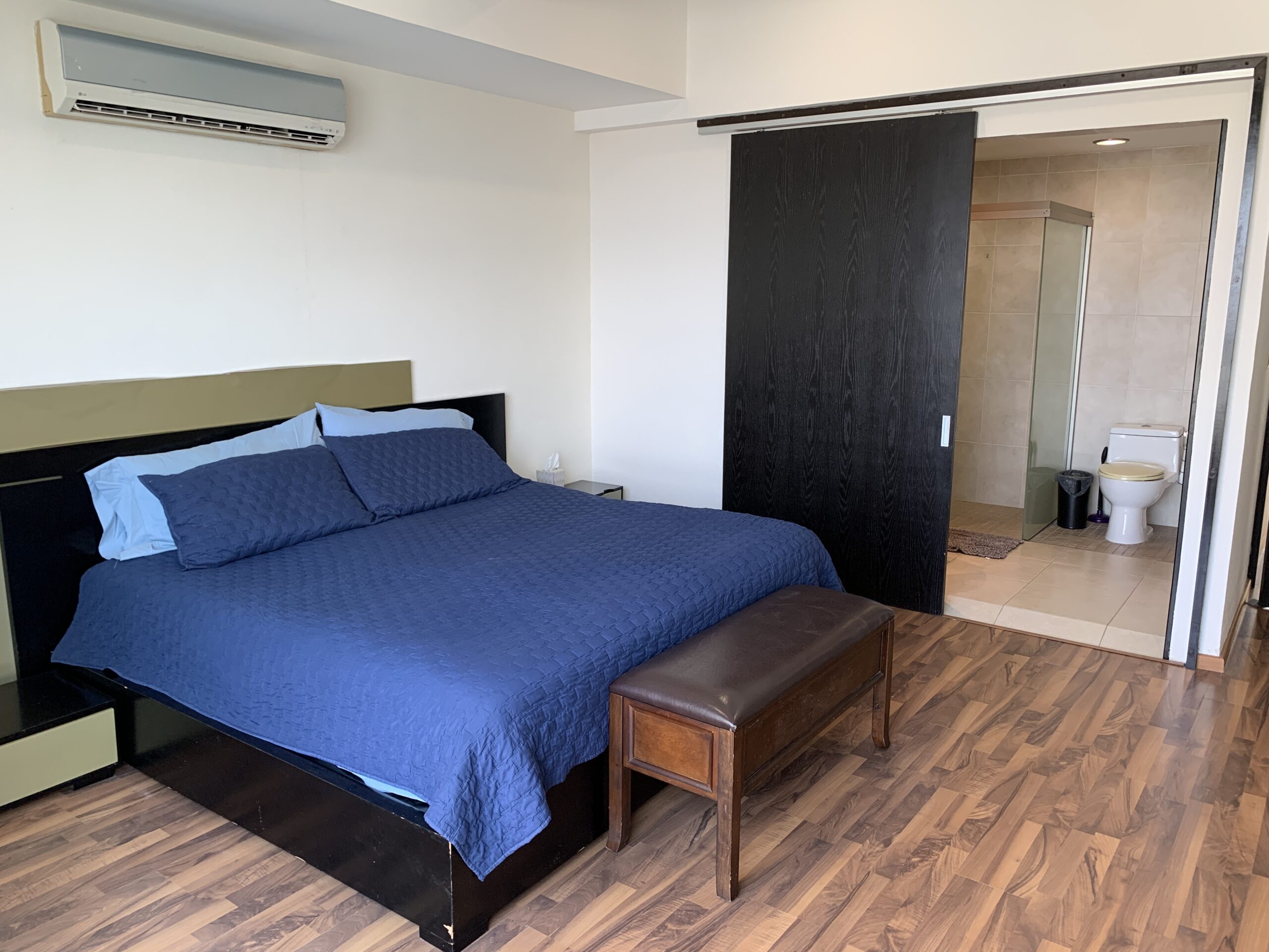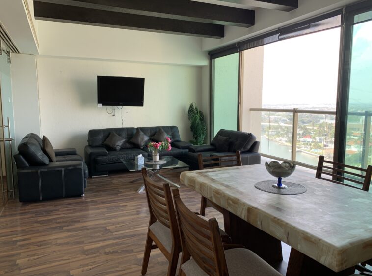 Disfruta de impresionantes vistas panorámicas de la ciudad desde este moderno apartamento de dos dormitorios. Las amplias ventanas en todas las habitaciones permiten disfrutar de la espectacular vista tanto de día como de noche, creando un ambiente inigualable para relajarse y disfrutar del paisaje urbano que colinda con el río y el mar. Cerca del centro comercial El Dorado.